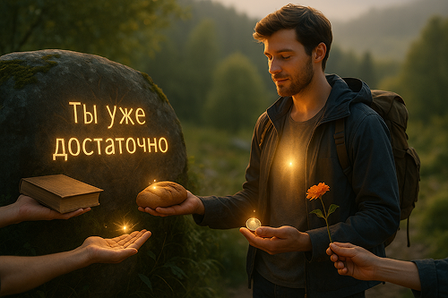 Когда проживаешь своё путешествие — признаёшь грани, говоришь правду, снимаешь доспехи, проживаешь роли и возвращаешься в присутствие — раскрывается настоящая ценность. Она не в ролях, оценках и цифрах. Главная ценность — твоё уникальное проживание пути: так, как можешь только ты. Все формы обмена — внимание, забота, деньги — лишь разные языки выражения этой ценности. Когда ценность признаётся в самом проживании, изобилие становится естественным спутником жизни.